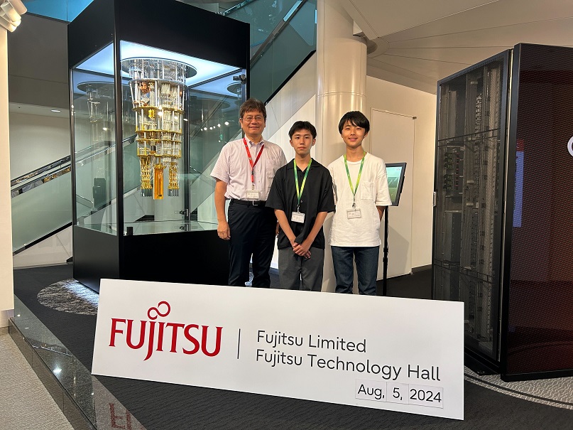 神奈川県川崎市にあるFujitsu Technology Parkを訪問し、富士通における量子コンピューティングへの取り組みについて研究員の方からご説明いただきました。本体である2cmの量子ビットチップを宇宙空間より冷やす希釈冷凍機は275cmもあり、大きく美しい量子シャンデリアの姿に生徒たちは感激していました。