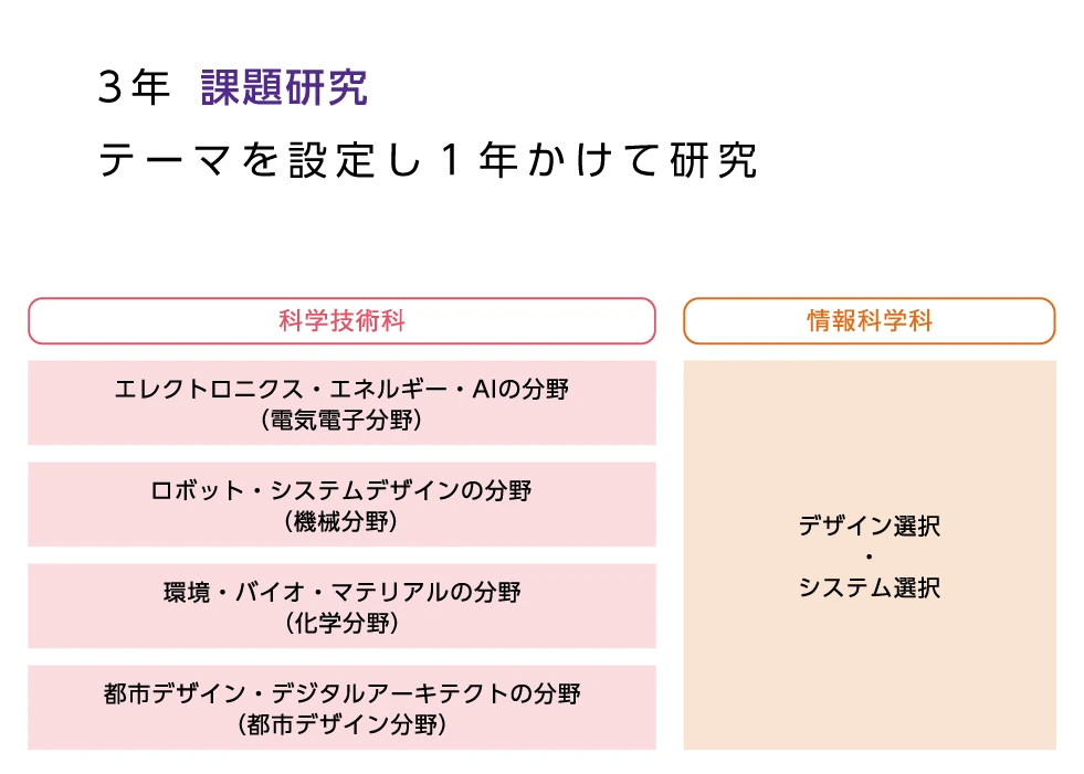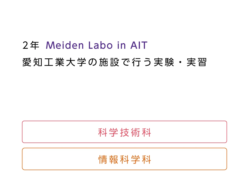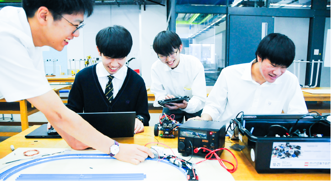 科学技術科と情報科学科は、「一握りのエリートではなく、企業(実社会)の第一線で活躍できる真の技術者を育てる」という建学の精神のもと、愛知工業大学との高大7カ年接続教育を行っています。STEAM 教育の充実を図り、AI 時代をリードする技術者の育成をめざしています。